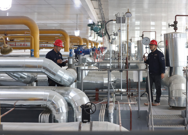 鲁谷北重尖峰热源厂,工作人员正在检查热水锅炉管线。新京报记者王贵彬摄